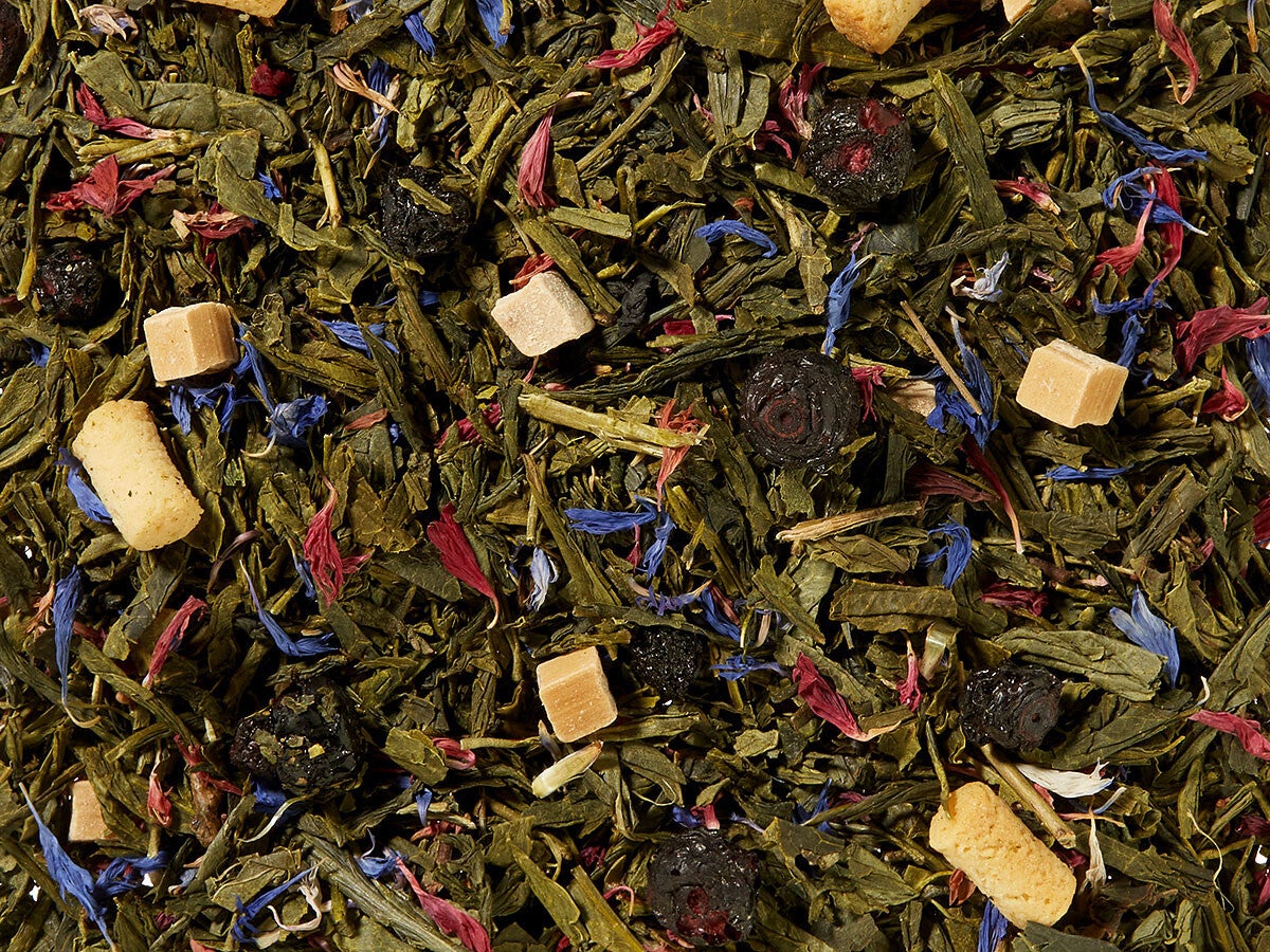 Ingrediënten: groene thee (84%), gevriesdroogde bosbessen, aroma, room-karamelstukjes (gezoete gecondenseerde magere melk, suiker, glucosestroop, botervet, bevochtigingsmiddel: sorbitol, emulgator: mono- en diglyceride van eetbare vetzuren), gevriesdroogde marsepeindruppels (amandelen, suiker, bevochtigingsmiddel: invertase), rode korenbloembloesems, blauwe korenbloembloesems