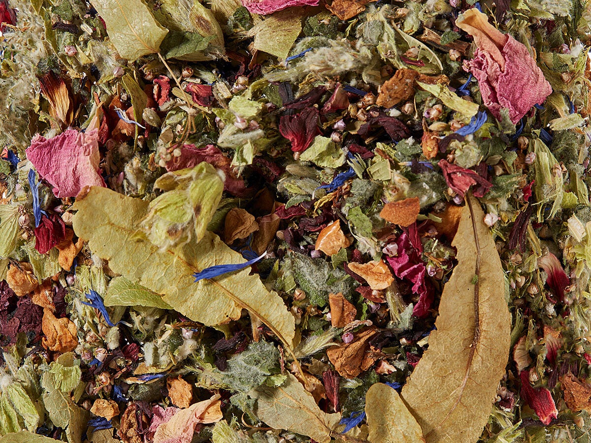 Ingrediënten: appelstukjes, hibiscusbloesems, Griekse bergthee, heidebloesems, appelmunt, zoete braamblaadjes, citroenverbena, zilveren lindebloesem, pioenbloemblaadjes, manukahoningpoeder (manukahoning, maltodextrine), papaverblaadjes, korenbloemen